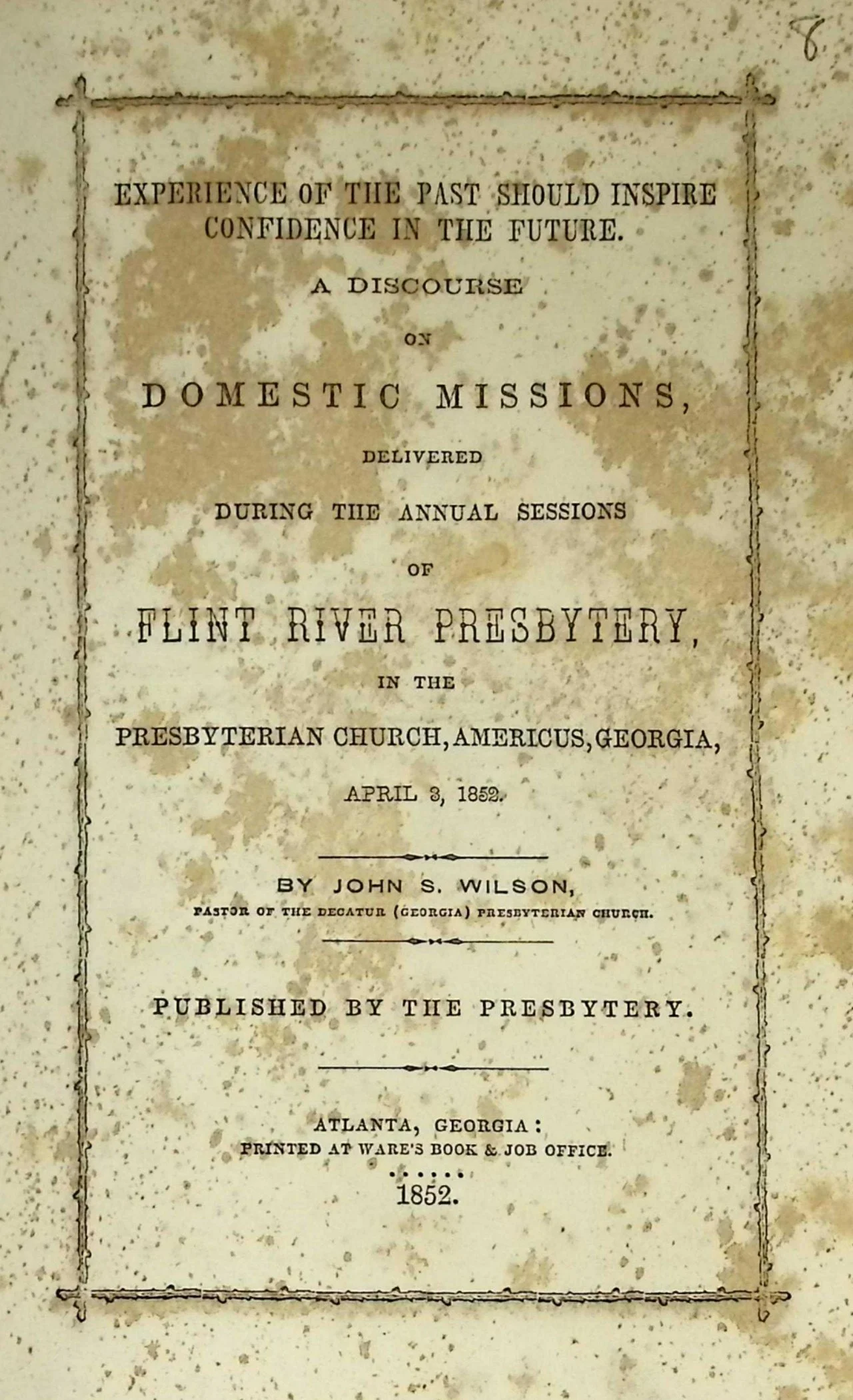 Experience of the Past Should Inspire Confidence in the Future: A Discourse on Domestic Missions, Delivered During the Annual Sessions of Flint River Presbytery, in the Presbyterian Church, Americus, Georgia, April 3, 1852 (1852)
