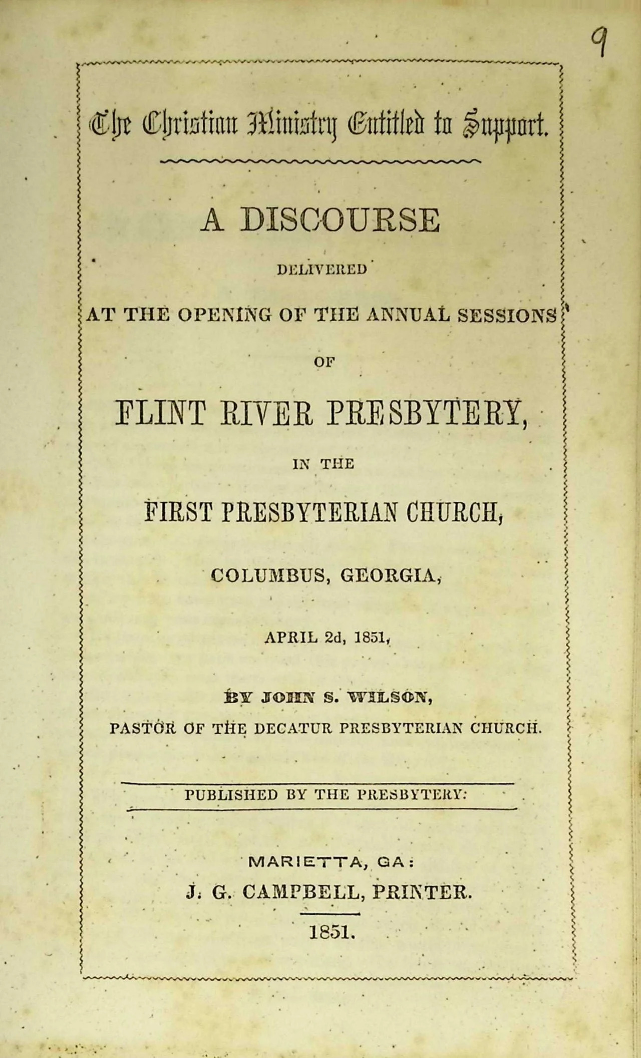 The Christian Ministry Entitled to Support: A Discourse Delivered at the Opening of the Annual Sessions of Flint River Presbytery, in the First Presbyterian Church, April 2nd, 1851 (1851)